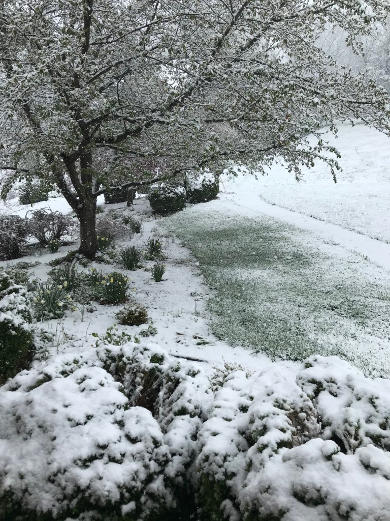 It snowed. In April. The 18th to be exact. After a gorgeous spring-like Easter. The redbuds were in full bloom and my front yard was peppered with miniature daffodils. Look closely and you can see them peaking out of the snow!